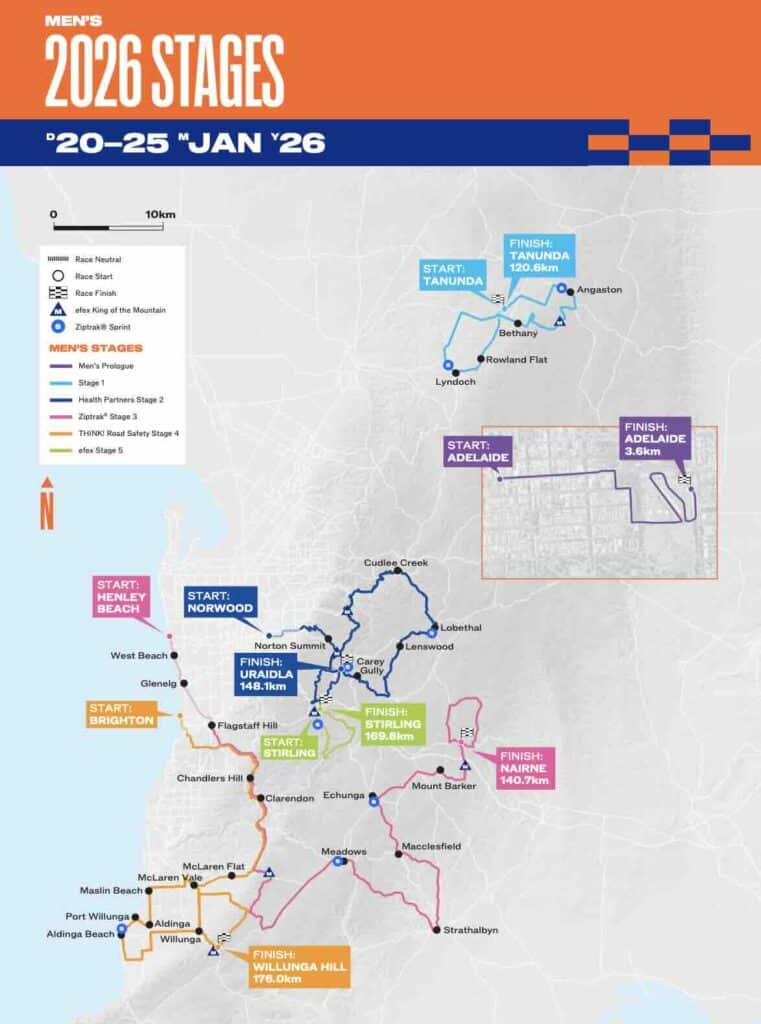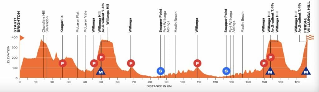 L’étape-reine, entre Brighton et Willunga Hill (4e étape), est tout simplement renversée. Les organisateurs ont concocté une version inédite et cauchemardesque de l’incontournable. Au programme : plus de 2500 mètres de dénivelé et… trois ascensions du Mur de Willunga. La première aura lieu au milieu de l’étape, après le passage par McLaren Vale. Les deux dernières se succéderont dans les 26 derniers kilomètres, formant un final d’anthologie.