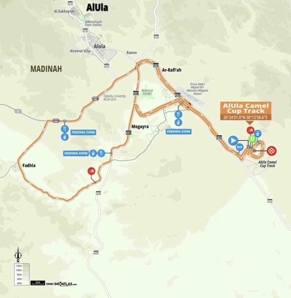 Mardi 27 janvier : AlUla Camel Cup Track > AlUla Camel Cup Track (158 km). Une boucle plate autour du site emblématique de la Camel Cup. Un final prévu pour les trains de sprint, où la puissance et le placement seront primordiaux.