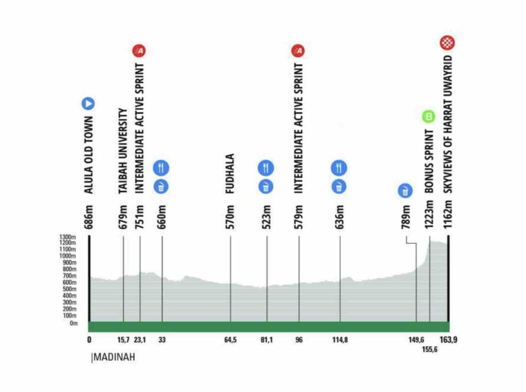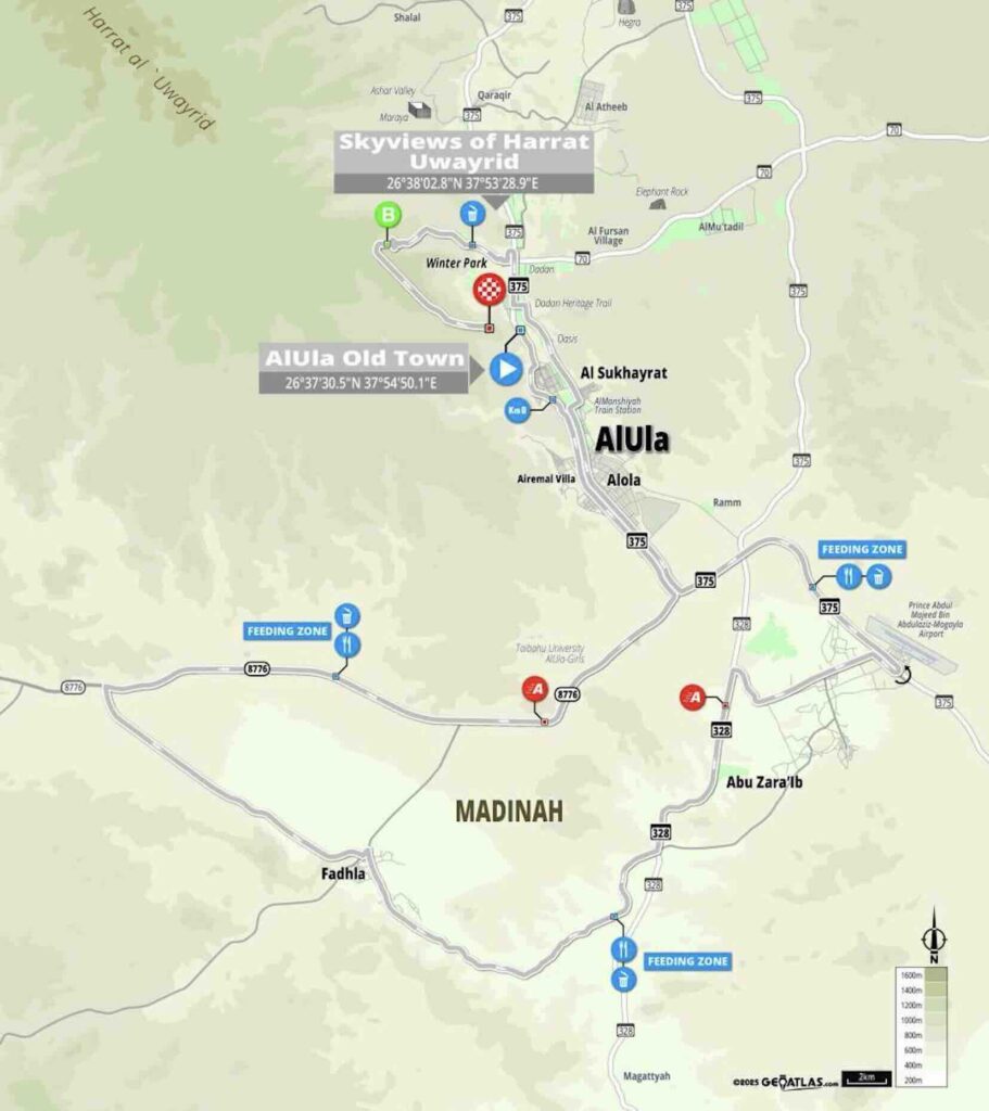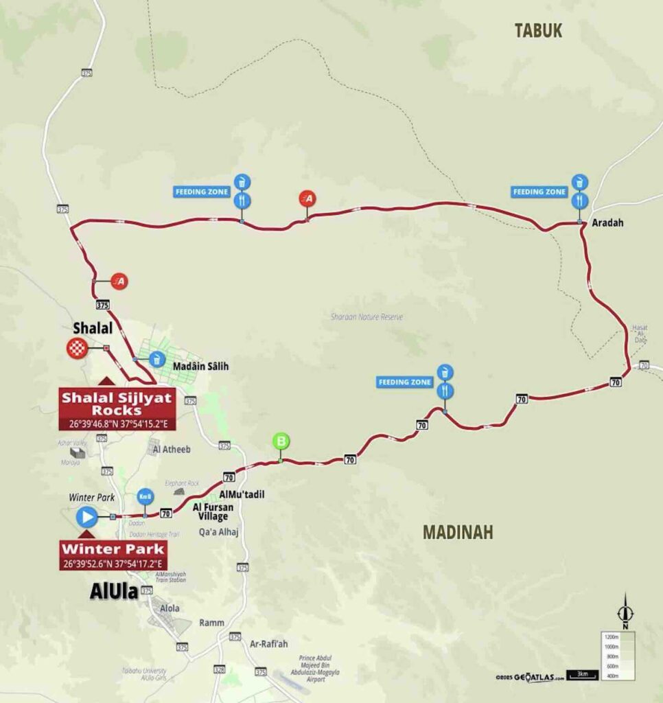 Samedi 31 janvier : AlUla Old Town > Skyviews of Harrat Uwayrid (163,9 km). L’étape reine. Le final implacable au sommet du Harrat Uwayrid, un site volcanique offrant une vue spectaculaire. Cette montée longue et pentue est promise aux grimpeurs. Le maillot de leader s’y jouera très probablement, assurant un suspense intact jusqu’au dernier coup de pédale.