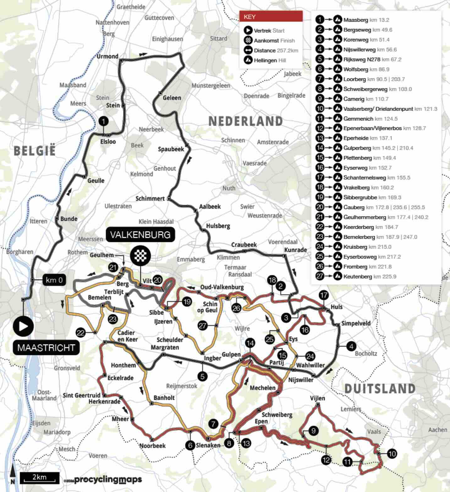 Le final en trois actes : À 11 km du but, le Bemelerberg sert de rampe de lancement. Puis, à 2,6 km de la ligne d’arrivée, la dernière ascension du Cauberg (800 m à 6,5% mais des pointes à 13%). Un final explosif où la puissance brute prime sur l’endurance.