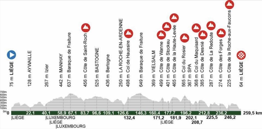 Présentée comme potentiellement « la plus dure de l’histoire » notamment dans sa version féminine, la Doyenne (259,5 km pour les hommes, 156 km pour les femmes) introduit des modifications stratégiques. La suppression de la Côte de Mont-le-Soie et l’insertion du Col du Maquisard (2,4 km à 5,7%) – placé entre le Rosier et la côte de Desnié – changent la donne. Cette séquence inédit (Maquisard + Desnié) dans le dernier tiers de course constitue un nouveau filtre, plus long et plus technique, avant l’enfer final (Redoute, Forges, Roche-aux-Faucons). Pour les femmes, l’ajout du Col de Haussire (3,9 km à 6,8%) en début de course et cette même association Maquisard-Desnié alourdissent significativement le profil. Selon les données de l’organisateur ASO, le dénivelé positif atteint 4 395 m pour les hommes et 2 830 m pour les femmes, des chiffres qui confirment la tendance à l’épuration.