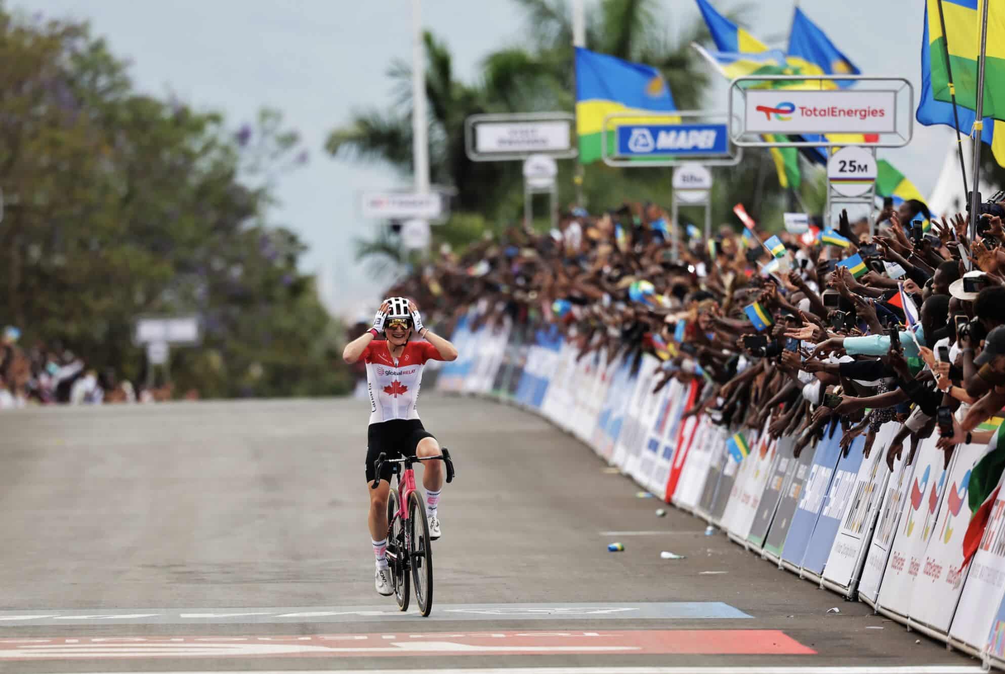 Ce samedi 27 septembre, la québecquoise, Magdeleine Vallieres est devenue Championne du monde 2025 à Kigali devant toutes les favorites. La coureuse de 24 ans était la plus forte du groupe de tête sortie au bon moment. Niamh Fisher-Black est seconde et Mavi Garcia 3ème. Demi Vollering a remporté le sprint du peloton des favorites pour la 7ème place.