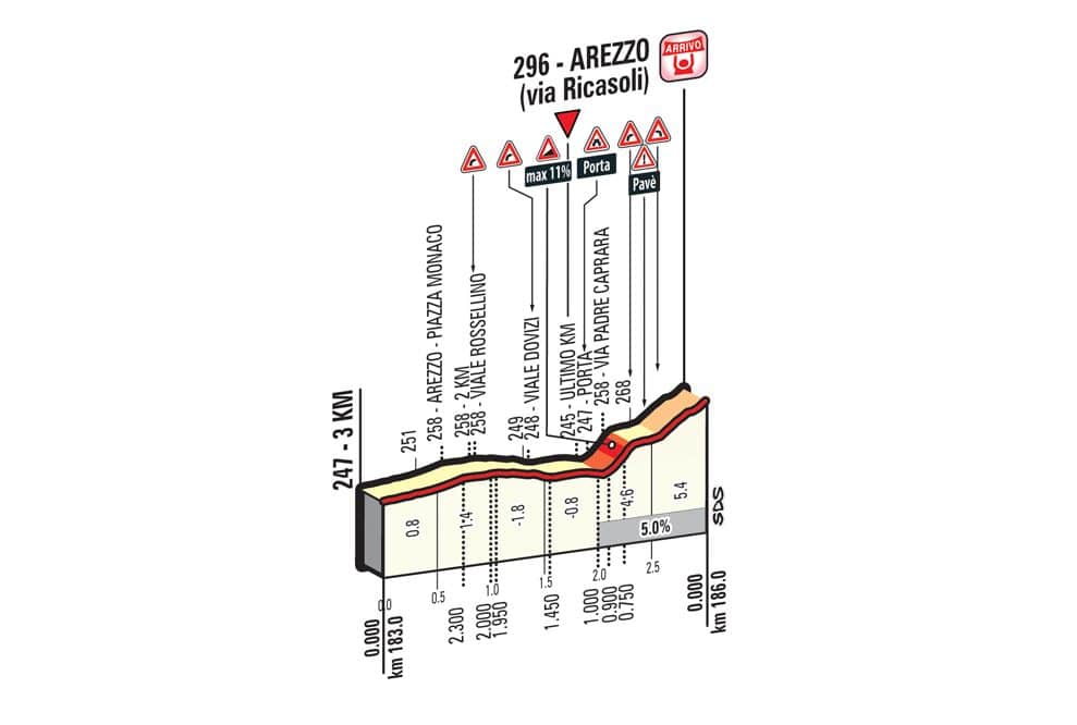 Après un sprint à Foligno, les coureurs retrouvent un terrain accidenté à l’occasion de la huitième étape du Tour d’Italie disputée entre la ville qui a servi d’arrivée hier et Arezzo sur une longueur de 187 kilomètres. Le parcours sera relativement plat jusqu’à cette première bosse de troisième catégorie à plus de 60 kilomètres de l’arrivée mais surtout ce juge de paix dont le sommet est situé à 20 kilomètres de la ligne. Cette dernière ascension est partiellement recouverte de terre et de gravier… Tout pour rappeler les Strade Bianche.