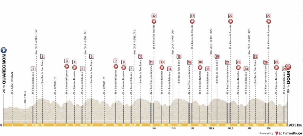 Pour cette 58e édition, les organisateurs ont légèrement retouché la copie. Si le départ est toujours donné à Quaregnon (12h30) et l’arrivée jugée à Dour (vers 17h15), le menu s’est enrichi. Le dénivelé total a été revu à la hausse. On ne parle pas ici des Alpes, mais sur des pentes courtes et violentes comme la Côte de la Roquette (600 m) ou la Côte des Nonettes (300 m), la moindre raideur supplémentaire se paye cash après 180 kilomètres dans les jambes.