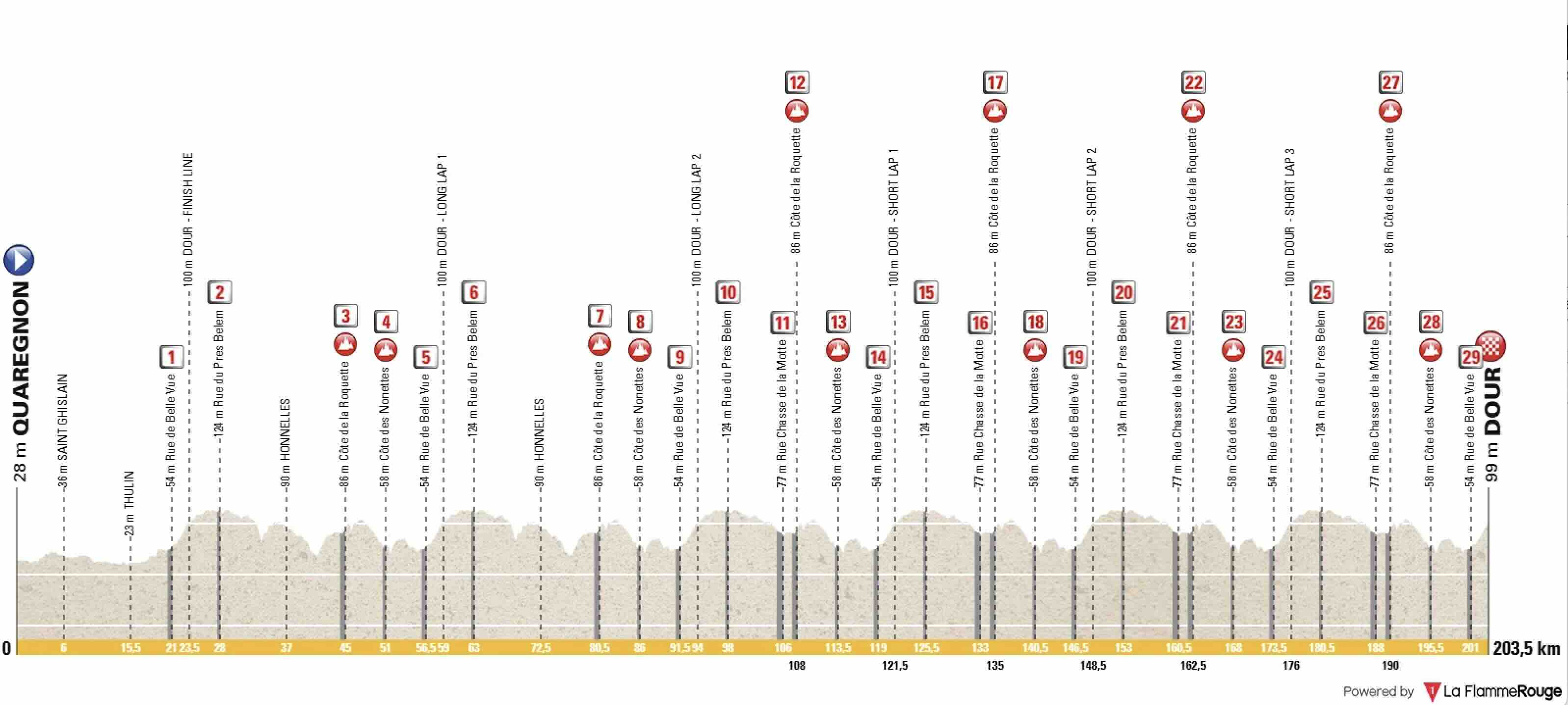 Le tracé se corse véritablement après le premier passage sur la ligne (km 91,5). C’est là que les coureurs entament une série de boucles. On dénombre pas moins de 29 secteurs répertoriés. Les puristes scruteront particulièrement le Chemin de Belian (Rue du Pres Belen), un long secteur de 1 400 mètres qui use autant les boyaux et pneus que le moral. Mais le véritable juge de paix, c’est l’enchaînement final.