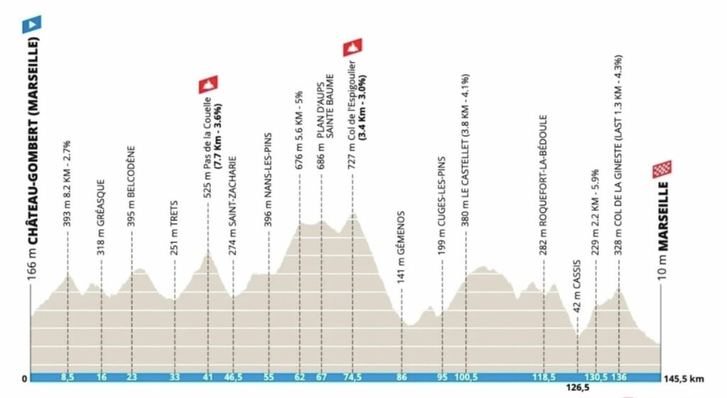 Le départ réel à Château-Gombert est un coup de feu. Immédiatement, 8 km à 3% montent vers Gréasque. C’est le terrain de jeu idéal pour la traditionnelle échappée matinale, composée souvent de baroudeurs et de jeunes loups avides de visibilité. Mais avec un peloton motivé et quatre équipes WorldTour (Decathlon CMA CGM, Alpecin-Premier Tech, Groupama-FDJ United, Lotto Intermarché), sa marge de manœuvre sera mince.