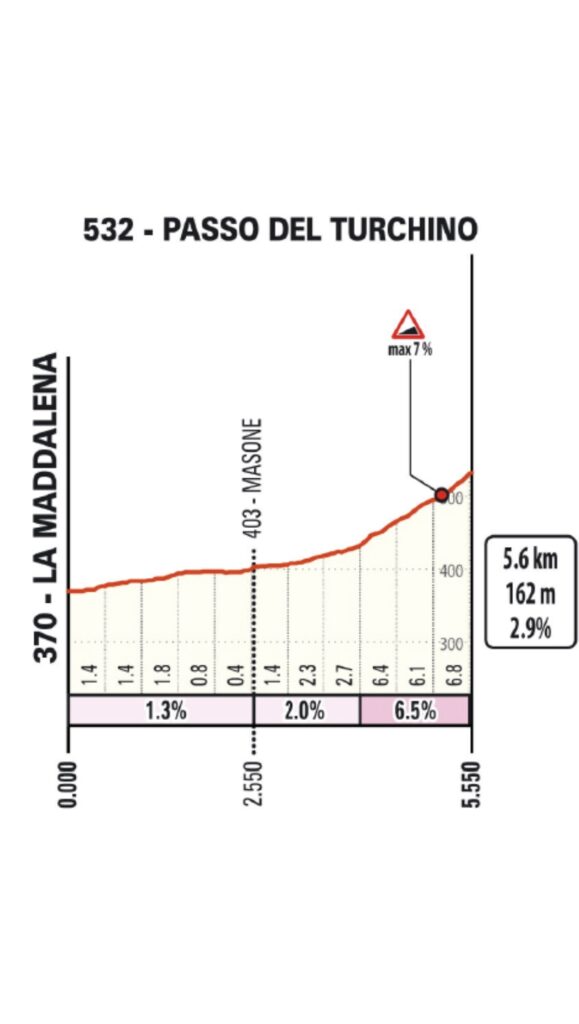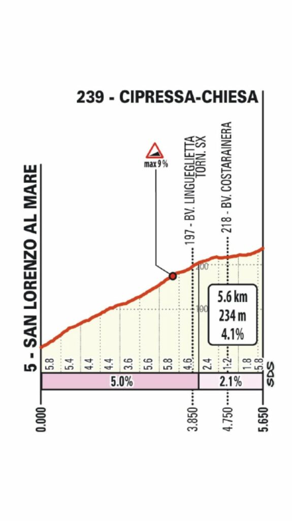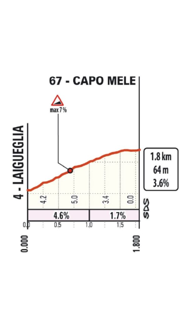 Le premier relief notable, le Passo del Turchino (5,6 km à 2,9%), est un vestige du passé. Autrefois décisif, il n’est plus aujourd’hui qu’une formalité, un premier point de repère qui sert à lancer la mise en jambes avant la longue descente vers Gênes-Voltri. Sa présence rappelle la tradition, mais son influence sur le classement final est marginale. Cependant, la descente rapide qui suit impose déjà une première vigilance.