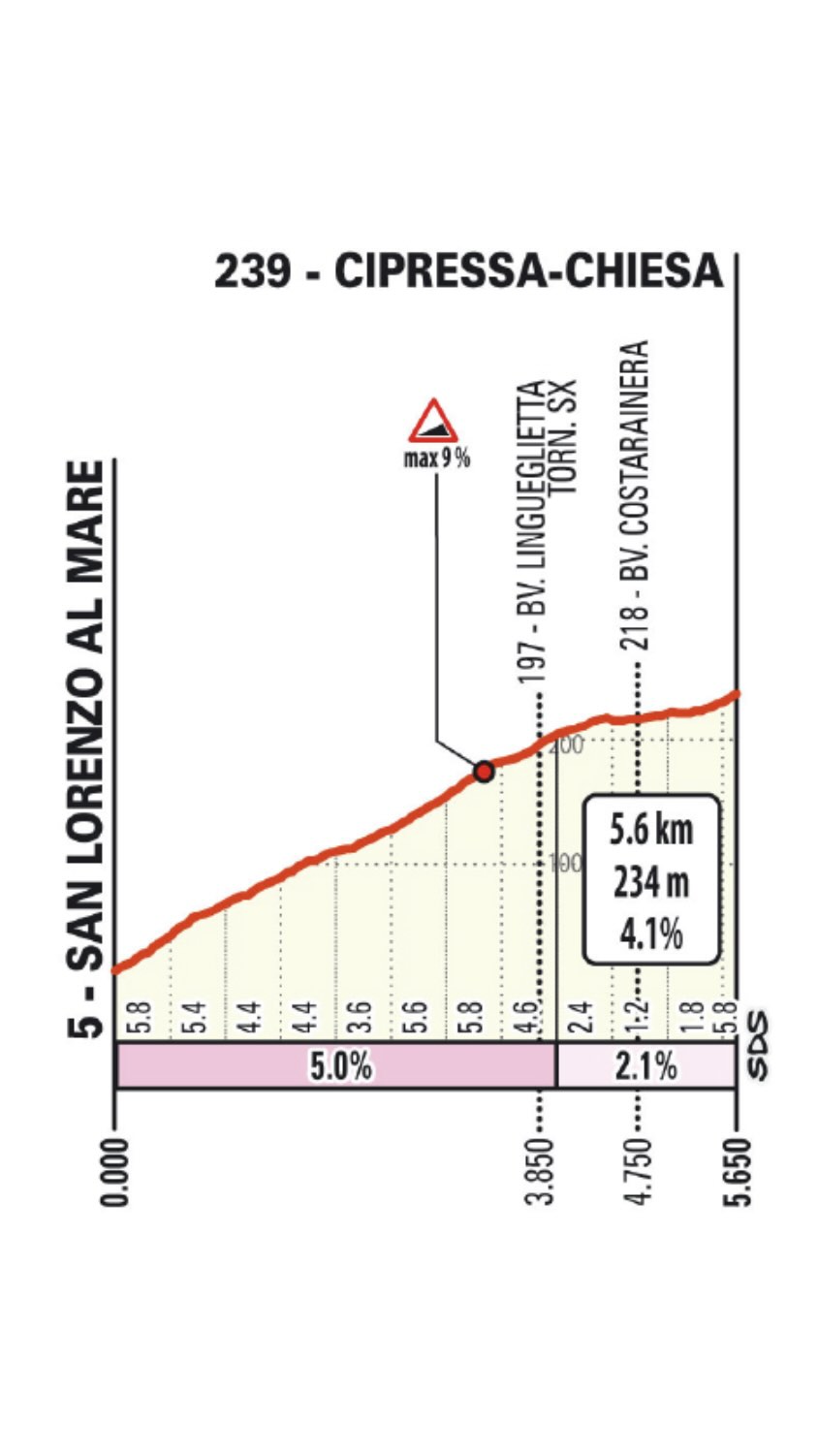 Le premier relief notable, le Passo del Turchino (5,6 km à 2,9%), est un vestige du passé. Autrefois décisif, il n’est plus aujourd’hui qu’une formalité, un premier point de repère qui sert à lancer la mise en jambes avant la longue descente vers Gênes-Voltri. Sa présence rappelle la tradition, mais son influence sur le classement final est marginale. Cependant, la descente rapide qui suit impose déjà une première vigilance.