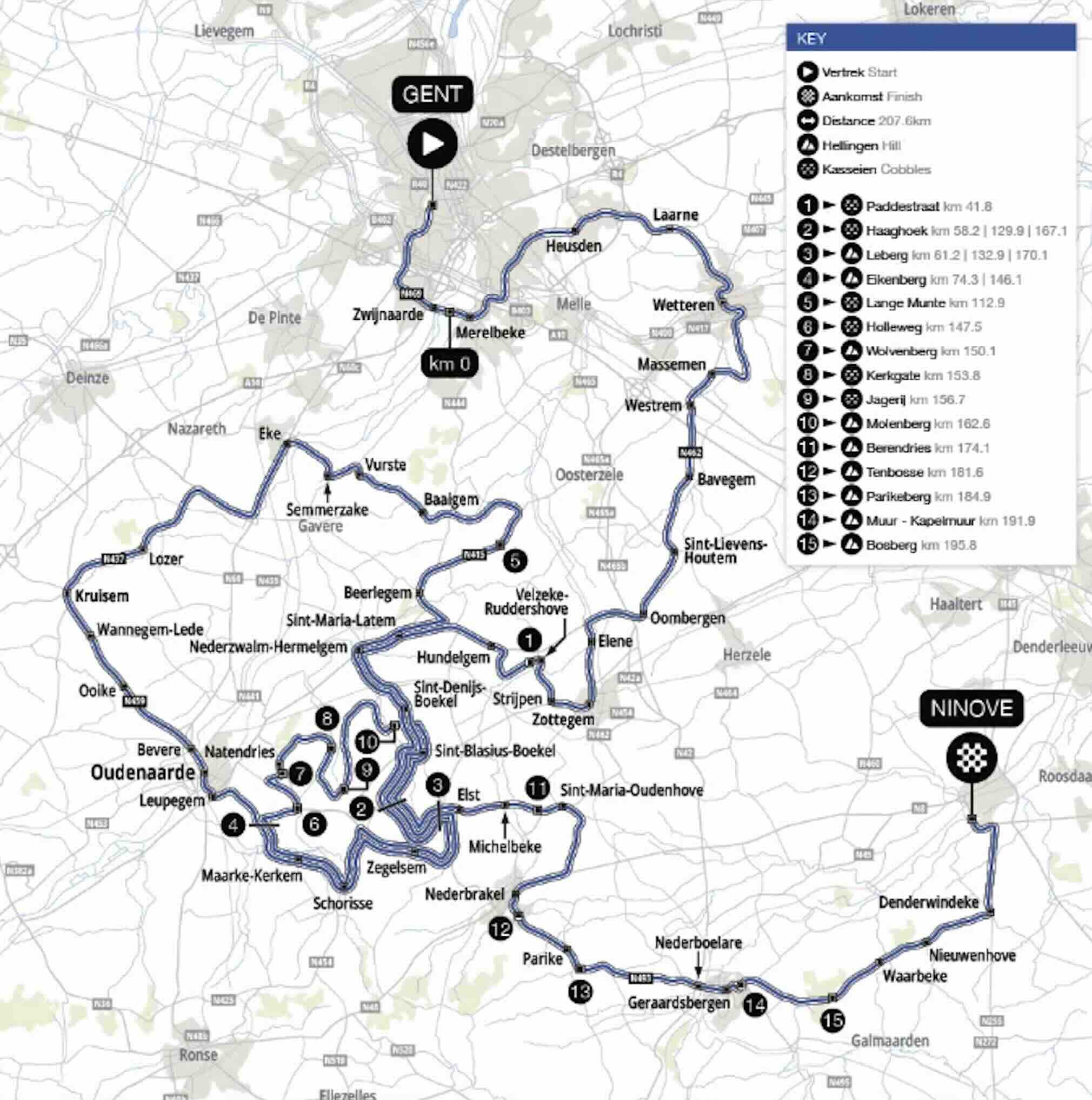 Les 130 premiers kilomètres ne sont pas une simple formalité. Le passage sur les longs secteurs pavés du Paddestraat (1500m) et du Haaghoek (1900m) à deux reprises peut être propice aux cassures, surtout si le vent s’en mêle. « C’est là que la course peut se perdre pour les distraits » dit-on à la rédaction. Le retour de l’Eikenberg (1200m à 5,8%), classé monument historique, après plusieurs années d’absence, ajoute une pincée de folklore et de difficulté technique.
