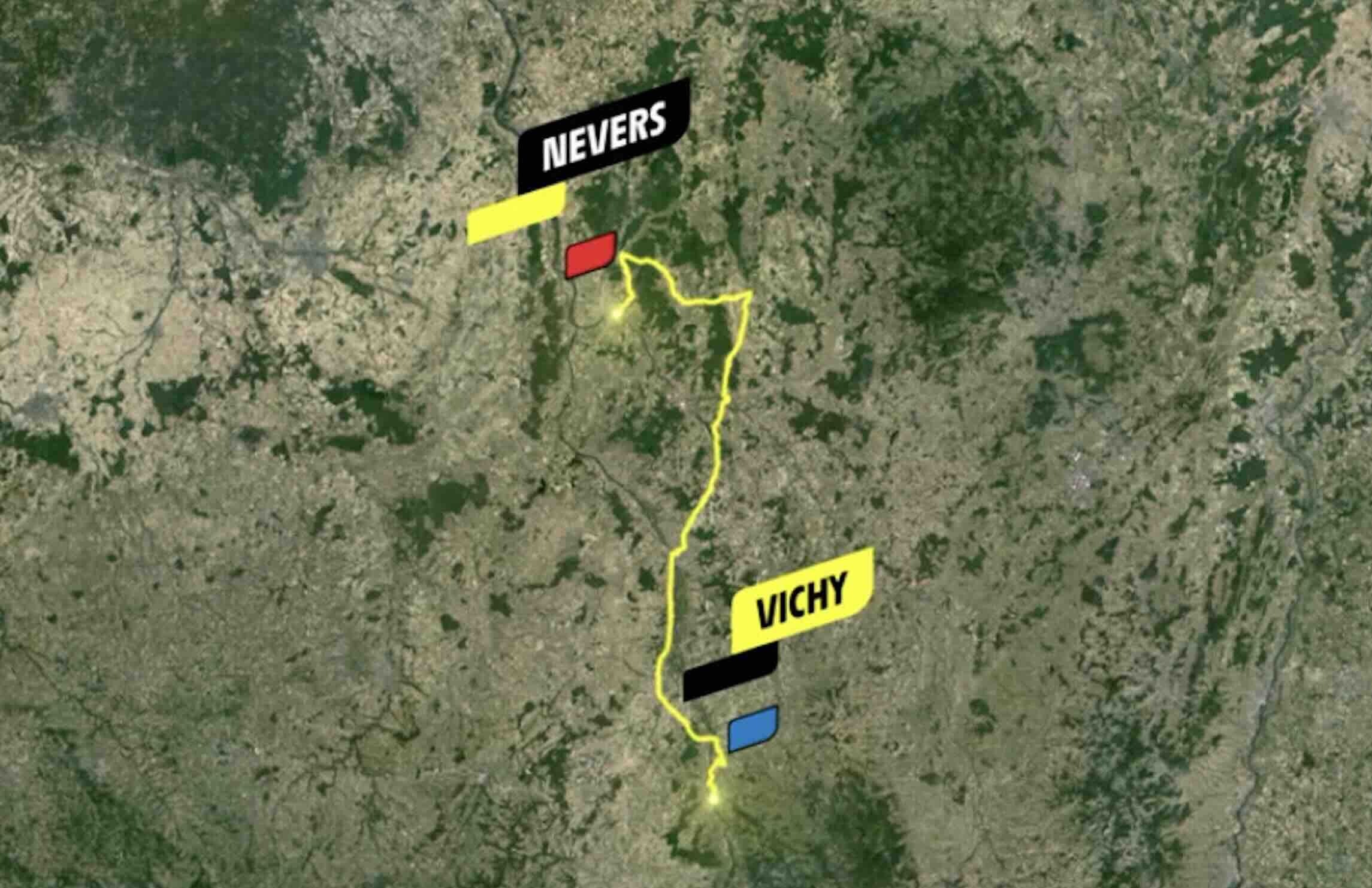 La carte est d’une simplicité trompeuse. Le tracé ondule à peine en quittant l’Allier pour la Nièvre, évitant soigneusement tout relief significatif. Les deux sprints intermédiaires, à Moulins et La Machine, serviront de répétition générale et de points de friction pour la maillot vert.