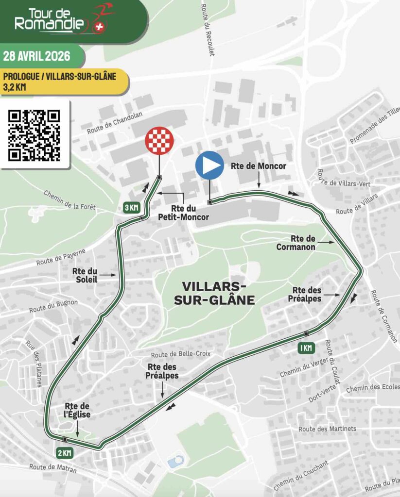 Ce mardi 28 avril, le Tour de Romandie 2026 s’ouvre par un exercice piégeux : 3,2 km autour de Villars-sur-Glane, entre descente rapide et rampe à 7 %. Tadej Pogačar (UAE Team Emirates XRG), jamais aligné sur un prologue cette saison, partira dernier à 17h27. Entre spécialistes du chrono et puncheurs-grimpeurs, la première tunique de leader se jouera à la fraction de seconde.