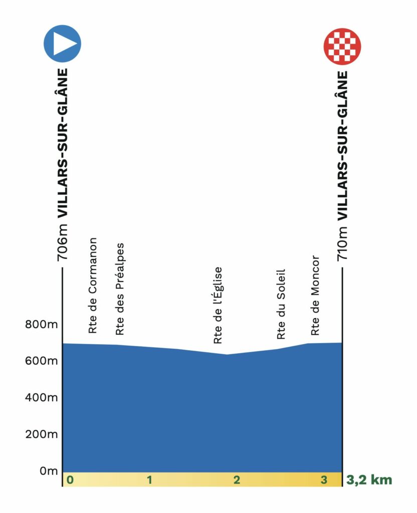 Ne vous fiez pas à la distance. Ce prologue du Tour de Romandie 2026, tracé entièrement à Villars-sur-Glane, enchaîne deux phases radicalement opposées. Les 600 premiers mètres plongent légèrement, puis la route bascule. Selon le profil officiel, l’ascension de la Route du Soleil grimpe sur 1,3 km à 5 % de moyenne, mais avec une rampe de 800 m à 6,9 %, voire 7 % sur le passage le plus dur. Logiquement, les écarts se feront sur ces quelques centaines de mètres où la pente exige de la puissance. À titre de comparaison, le prologue du Tour de Romandie 2025 (remporté par Sam Watson) était plus roulant. Ici, les sprinteurs purs risquent de payer la montée, tandis que les grimpeurs trop légers manqueront de watts.