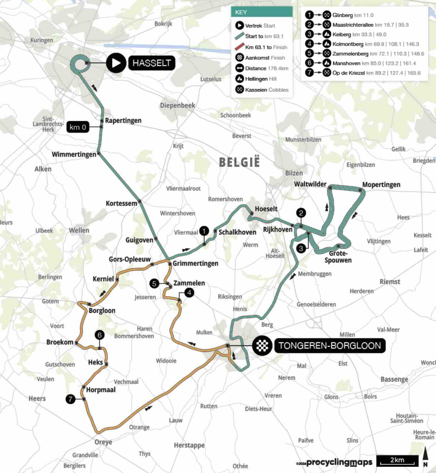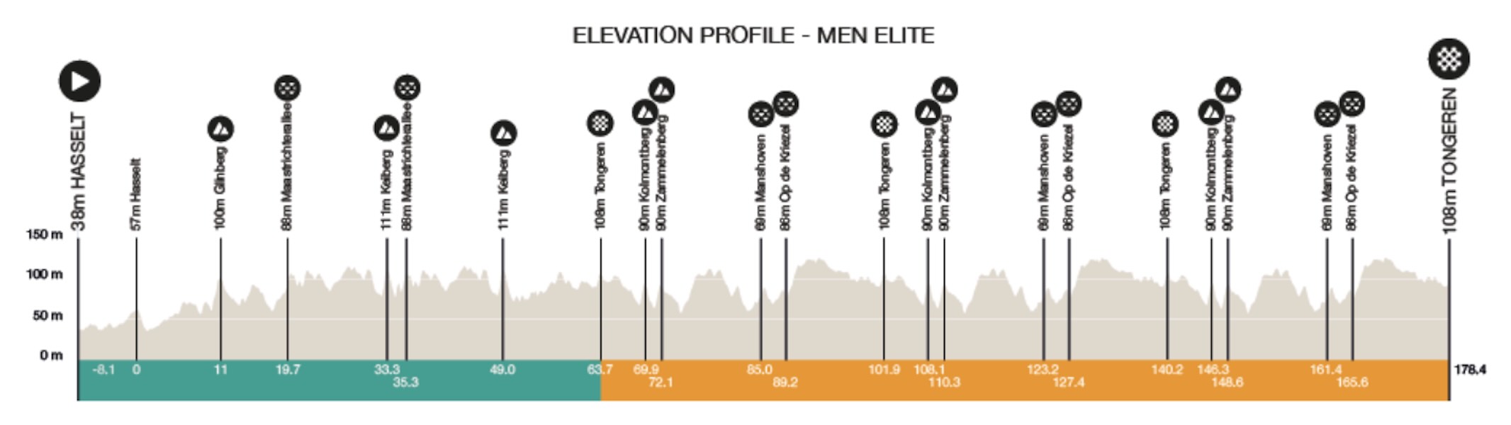 Dès les premiers kilomètres, le Glinberg (700 m à 3,6 %) et le Keiberg (600 m à 4,7 %, gravi deux fois) imposent un rythme élevé. Puis viennent les secteurs pavés de la Maastrichterallee, déjà empruntés lors des Championnats d’Europe 2024. Mais la véritable clé du parcours réside dans le circuit final autour de Tongres : trois tours de 38,2 km, avec la répétition du Kolmontberg (1,5 km à 3,1 %) et du Zammelenberg (800 m à 4,3 %), immédiatement suivis des pavés de Manshoven et d’Op de Kriezel.