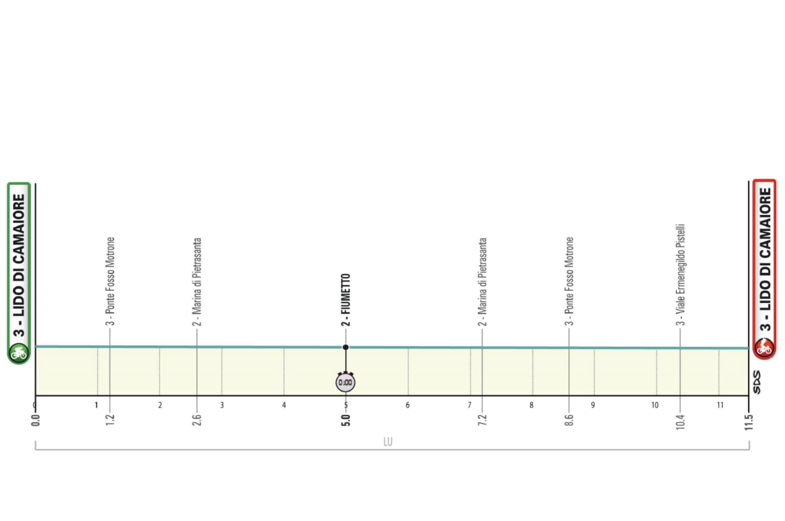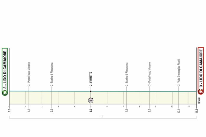 Imaginez : 4,5 kilomètres de ligne droite pure en bord de mer pour se mettre en danseuse, un demi-tour à 180 degrés à Fiumetto, et le même ruban d’asphalte à reprendre en sens inverse. Le profil est annoncé comme « parfaitement plat », et il l’est. Ce sont 11,5 kilomètres de bitume où le seul véritable adversaire, outre le chronomètre, est le vent. En longeant la mer Tyrrhénienne, les coureurs ne sont jamais à l’abri d’une brise qui pourrait transformer cet exercice de puissance en casse-tête d’aérodynamisme.